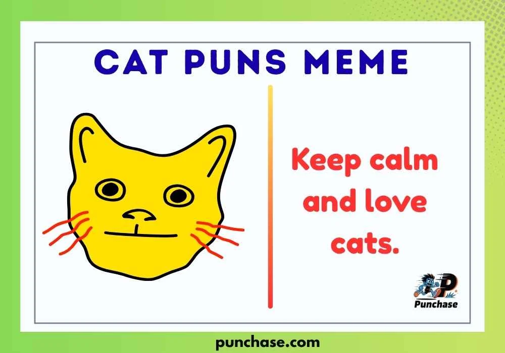 A cat puns meme is a funny joke or caption that uses cat words like meow, paws, and purr for humor.
